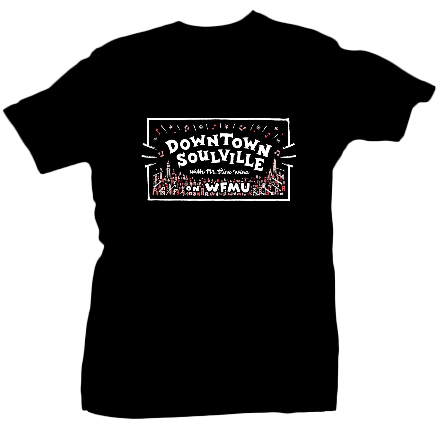 "Downtown Soulville" hosted by Mr. Fine Wine remains one of the longest-running and best soul programs on radio. This vibrant design captures the excitement of the show on a sleek black T-shirt.